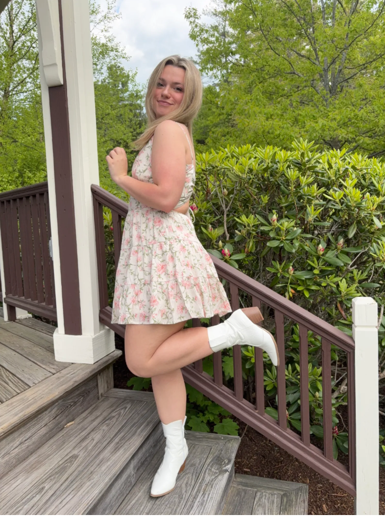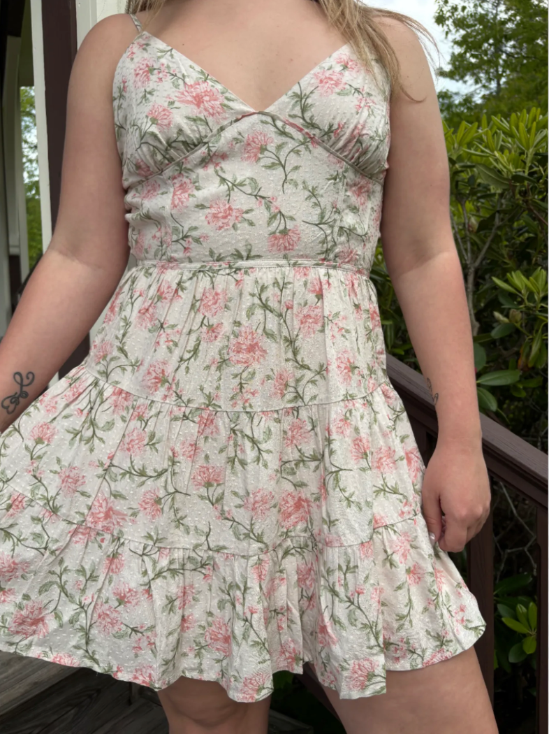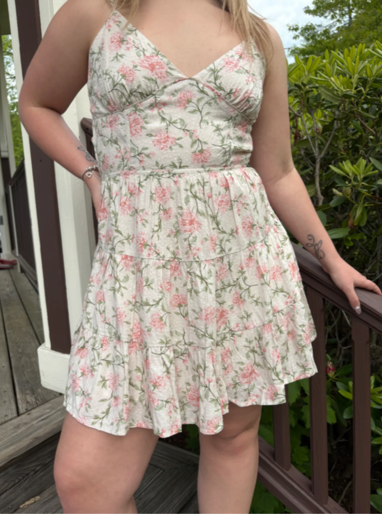 Featuring a flattering V neckline, an open low back with an adjustable tie, and a hidden side zipper for a seamless fit, this piece blends romantic detail with effortless wearability. The pink floral print adds a feminine touch, while the mid-to-upper thigh length makes it perfect for golden hour, date night, or anything in between.